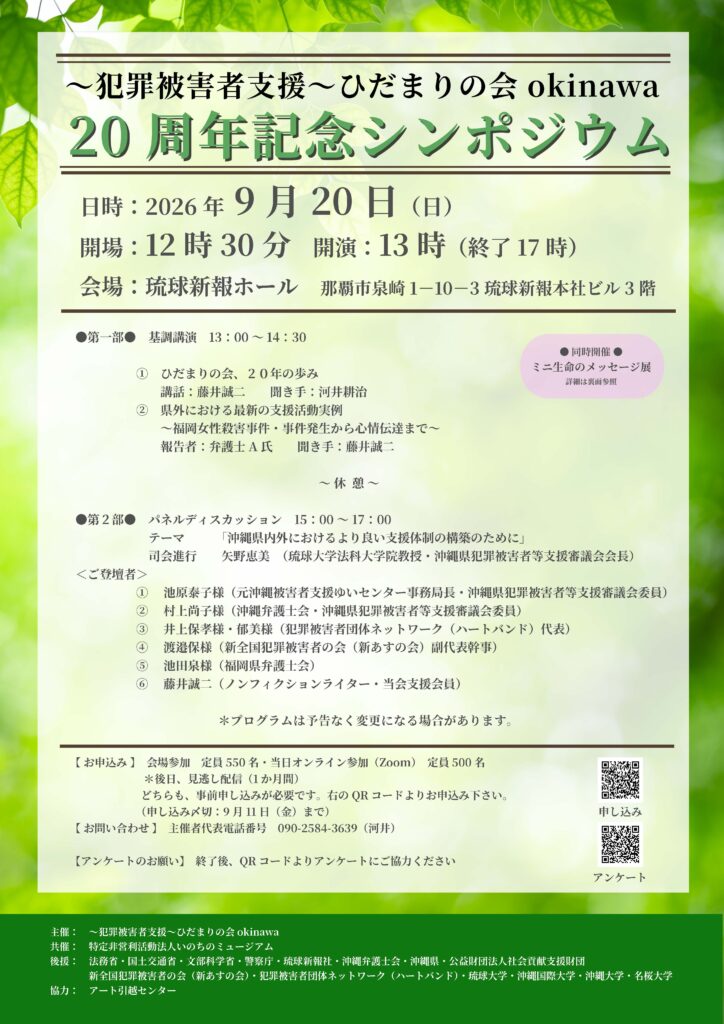 『~犯罪被害者支援~ひだまりの会okinawa 20周年記念シンポジウム』の開催が決定しました。皆様のご参加をお待ちしております。