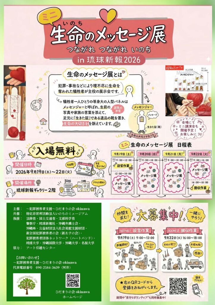 『~犯罪被害者支援~ひだまりの会okinawa 20周年記念シンポジウム』の開催が決定しました。皆様のご参加をお待ちしております。